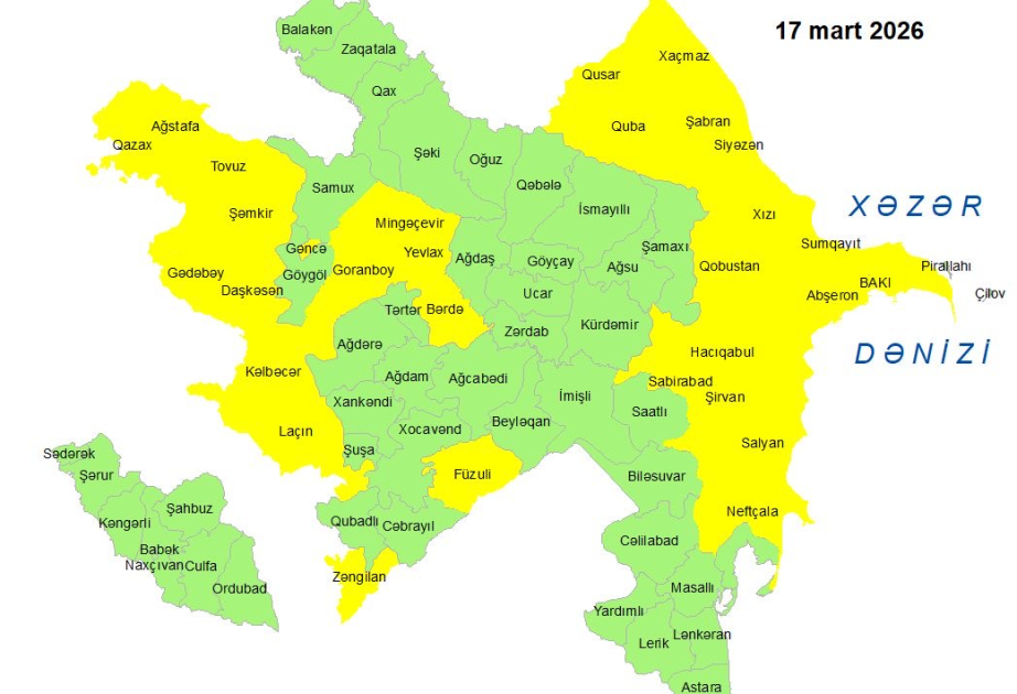 Национальная гидрометеорологическая служба объявила желтое предупреждение в связи с ветреной погодой, ожидаемой 17 марта в Баку и на Абшеронском полуострове, а также в некоторых регионах.