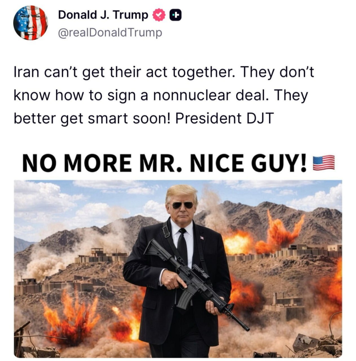 «Больше никакого «хорошего парня»!» - написано на сгенерированном ИИ-фото, где Трамп держит в руках автомат на фоне взрывов.