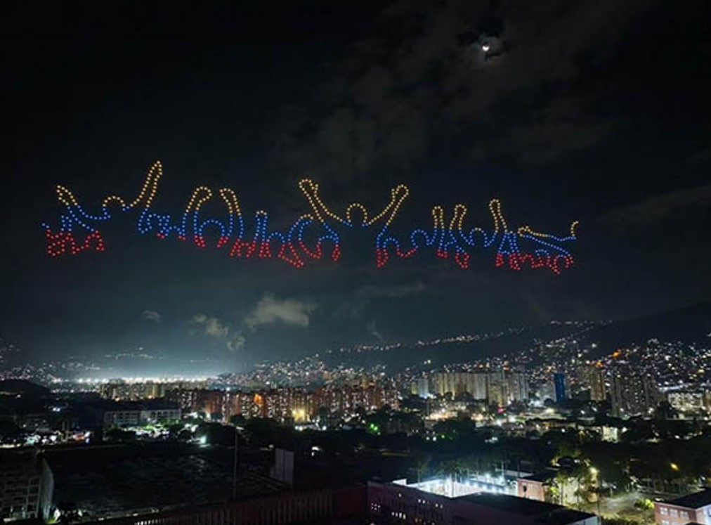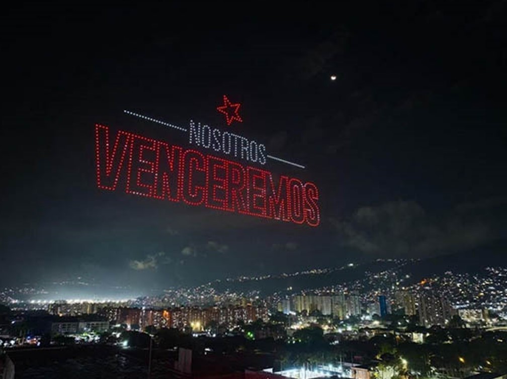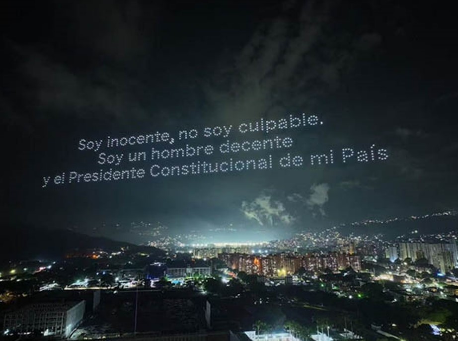 В небе над Каракасом с помощью беспилотников появилось изображение президента Венесуэлы Николаса Мадуро и его жены Силии Флорес, захваченных Соединёнными Штатами. Кадры из соцсетей опубликовал портал Cubadebate.