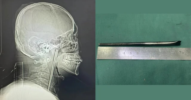 Обследование показало, что металлическая палочка застряла в задней части горла, при этом около трех сантиметров предмета выступали вверх. Несмотря на длительное пребывание инородного тела, врачи не обнаружили значительных кровотечений или язв.