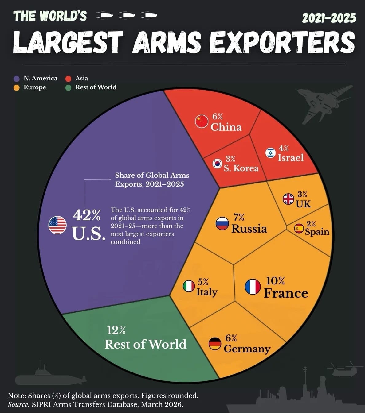 Согласно данным SIPRI, США уверенно занимают первое место, обеспечивая около 42% мировых поставок оружия. За ними следует значительно более удаленная группа стран - Франция, Россия, Китай и Германия. В то же время новые поставщики, такие как Южная Корея, быстро расширяют свое присутствие на мировом рынке.