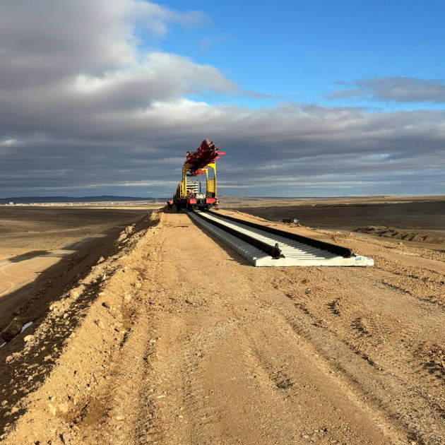 Формирование земляного полотна завершено на 90% - отсыпано 14,3 млн кубометров. Ведется укладка рельсошпальной решетки встречными темпами со стороны станций Мойынты и Кызылжар. В строительстве задействовано свыше 1500 специалистов и более 580 единиц техники.