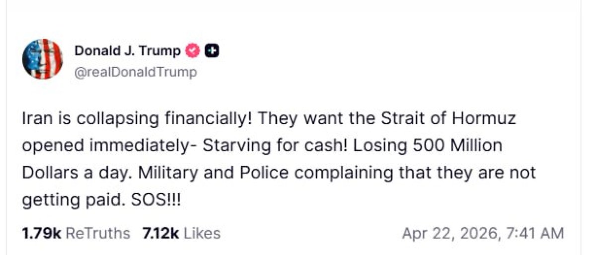 «Иран терпит финансовый крах! Они требуют немедленно открыть Ормузский пролив — отчаянно нужны деньги! Теряют по 500 миллионов долларов в день. Армия и полиция жалуются, что им не платят зарплату. SOS!!!» — написал американский лидер в Truth Social.