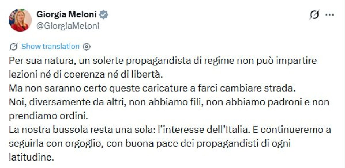 По ее словам, существует единственный ориентир, и это интересы Италии. Она заверила, что будет «следовать ему с гордостью, к большому огорчению пропагандистов, по всему миру».