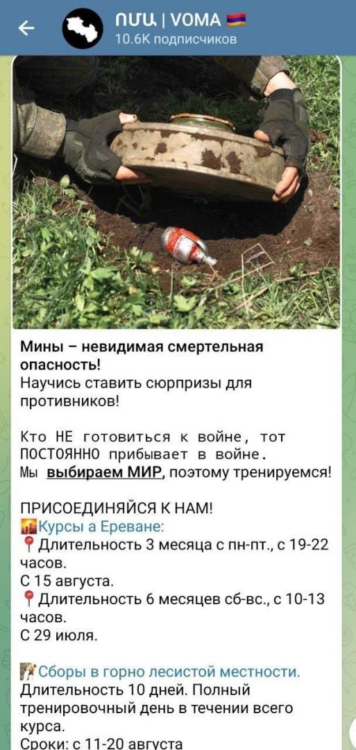 Так, в одном из рекламных объявлений о наборе желающих записано: «Наша цель - подготовка 100 тыс. патриотов Армении и членов диаспоры независимо от пола и возраста к ответу на потенциальные угрозы и укрепление стратегически важных территорий».