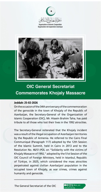 Генеральный секретарь еще раз подчеркнул, что Ходжалинские события стали результатом оккупации азербайджанских территорий со стороны Республики Армения. Ссылаясь на Каирскую итоговую декларацию (пункт 117), принятую на 12-й сессии Исламского саммита в Каире в 2013 году, и Резолюцию номер 46/51-POL «Солидарность с жертвами Ходжалинской резни 1992 года», принятую на 51-й сессии Совета министров иностранных дел ОИС в Стамбуле (Турецкая Республика) в 2025 году, он расценил массовые зверства, совершенные против мирного азербайджанского населения в оккупированном городе Ходжалы, как военное преступление, преступление против человечности и геноцид.