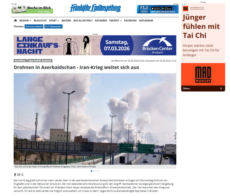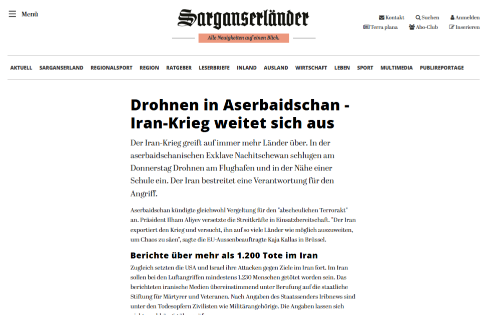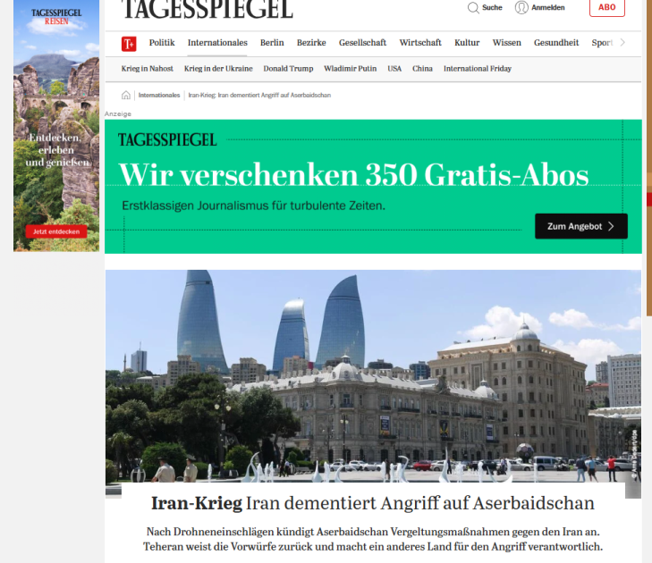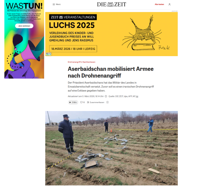 Немецкие медиа осветили основные моменты выступления главы государства. В материалах газет и порталов Morgenpost, Börsen News, FLZ. News, Tagesspiegel, Frankfurter Rundschau, Wirthschau Woche, Die Zeit, Ad Hoc News, Cash, Sarganserländer, Ostfriesen Zeitung отмечается, что в результате атаки беспилотников в Нахчыванской Автономной Республике Азербайджана были поражены аэропорт, здание школы и другие гражданские объекты. Подчеркивается, что на заседании Совета безопасности под председательством Президента Ильхама Алиева эта атака была решительно осуждена. Посол Ирана был вызван в Министерство иностранных дел Азербайджана в связи с инцидентом. Азербайджанский лидер назвал атаку Ирана «террористическим актом», после чего по его указанию Вооруженные силы Азербайджана были приведены в состояние высокой боевой готовности.
