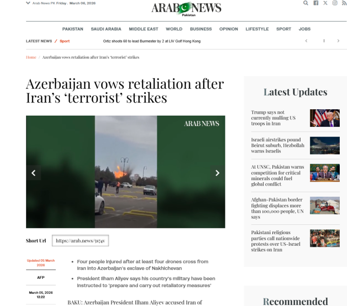 В статье, опубликованной в саудовской газете Arab News, отмечается, что Президент Азербайджана Ильхам Алиев обвинил Иран в совершении «террористического акта» после ударов беспилотников в четверг, в результате которых пострадали четыре человека. В статье говорится: «Баку заявил, что полуденные атаки были связаны как минимум с четырьмя беспилотниками, которые проникли в Нахчыванский анклав Азербайджана, граничащий с Ираном. Президент Алиев заявил на экстренном заседании Совета Безопасности: «Сегодня со стороны Ирана был совершен террористический акт против азербайджанской территории, против Азербайджанского государства. Иранское государство выпустило беспилотники по территории Нахчыванской Автономной Республики. Целями огня были гражданские объекты». Он сказал, что Азербайджанской армии поручено подготовить и осуществить ответные меры».
