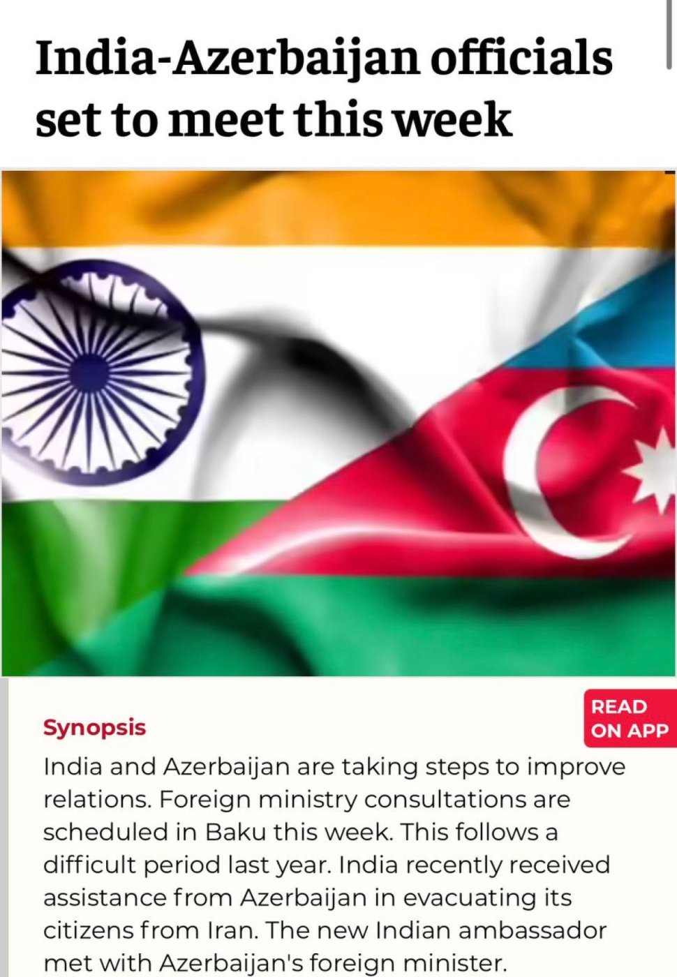 На встрече министра иностранных дел Азербайджана Джейхуна Байрамова с новым послом Индии Абхаем Кумаром индийская сторона выразила признательность за содействие в эвакуации около 200 граждан Индии из Ирана в условиях обострения конфликта в регионе.
