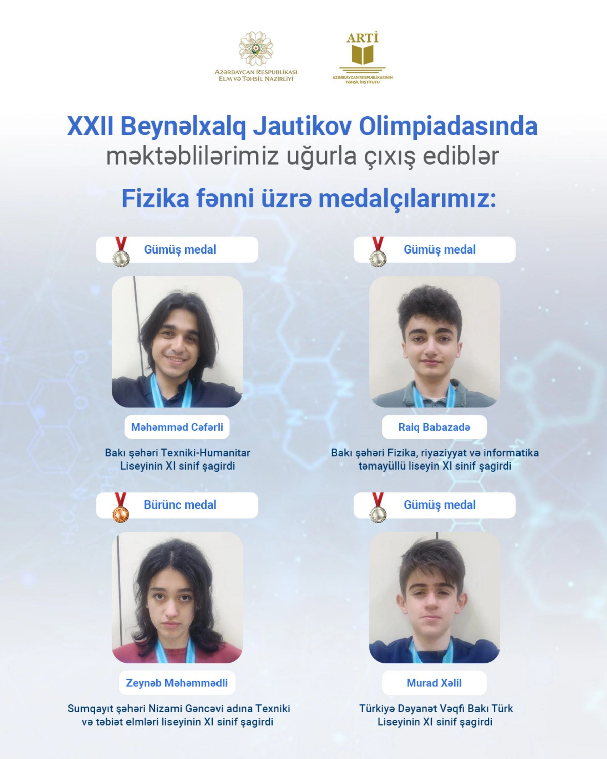 Как сообщает Report со ссылкой на Институт образования, по физике серебряных медалей удостоились ученик XI класса Технико-гуманитарного лицея города Баку Мухаммед Джафарли, ученик XI класса лицея с уклоном физики, математики и информатики города Баку Раиг Бабазаде и ученик XI класса Бакинского турецкого лицея Мурад Халил, а бронзовой медали - ученица XI класса Сумгайытского лицея Технических и естественных наук имени Низами Гянджеви Зейнаб Мамедли.