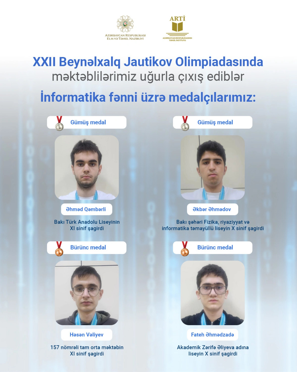 По информатике серебряных медалей были удостоены ученик XI класса Бакинского турецкого анатолийского лицея Ахмед Гамбарли и ученик X класса лицея с уклоном физики, математики и информатики города Баку Акпер Ахмедов, а бронзовых медалей - ученик XI класса средней школы №157 Гасан Велиев и ученик X класса лицея имени академика Зарифы Алиевой Фатех Ахмедзаде.