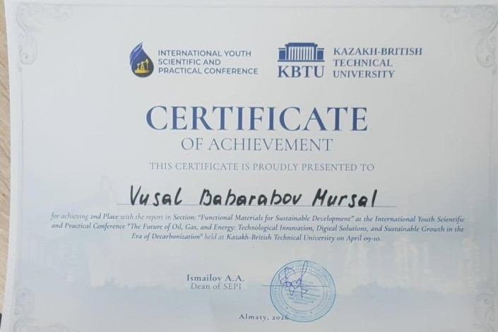 На секции «Функциональные материалы для устойчивого развития» Вюсал представил работу, посвященную будущему нашей экологии. Его исследование модификации биоразлагаемых полимеров и создания экологически чистых композитных материалов вызвало живой интерес у экспертов. Итогом защиты стало почетное второе место, что подтверждает высокий уровень подготовки азербайджанской инженерной школы.